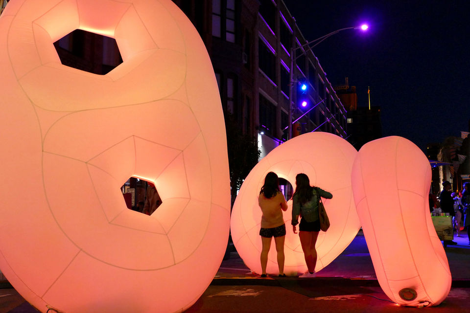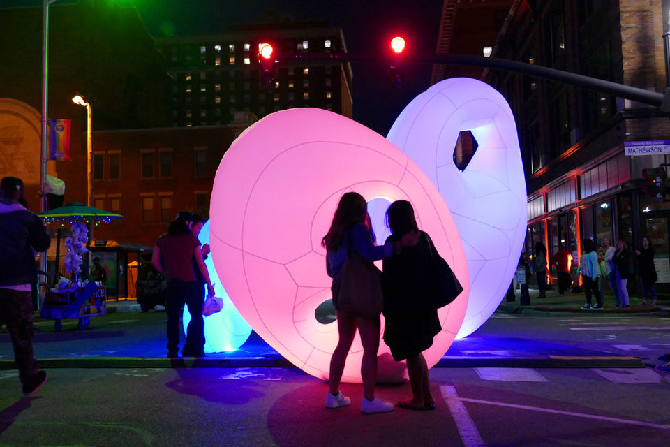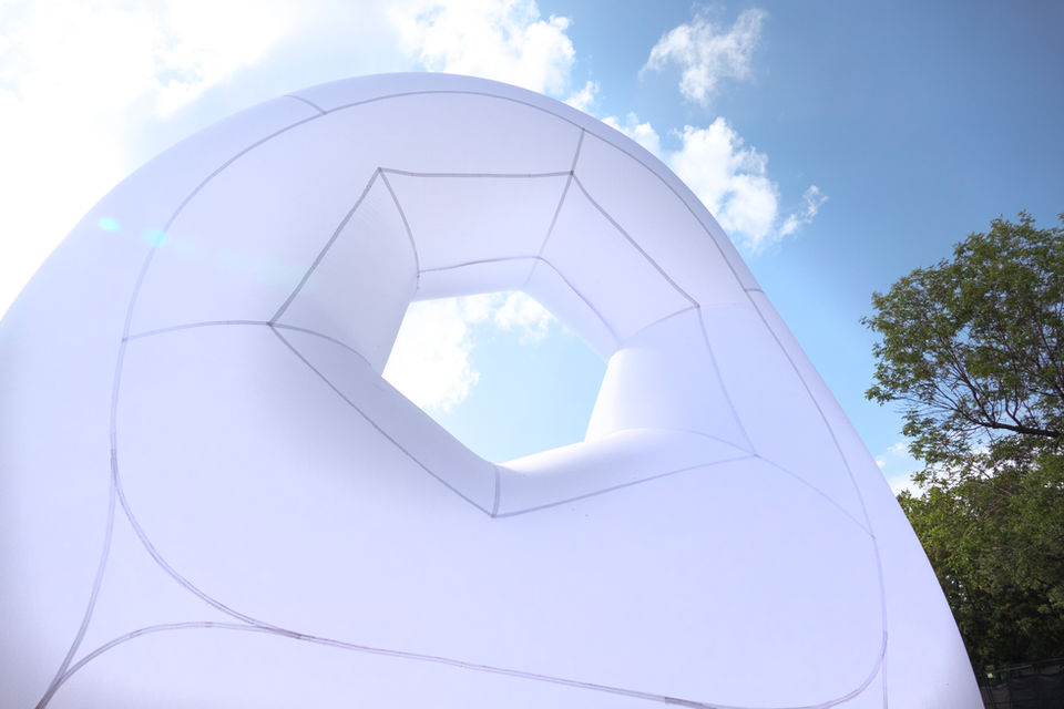 The Cloud Lights pull the sky closer to the Earth. In daylight their curving white forms provide shade and echo the exhilaration of being parallel to the clouds in flight. At night they are illuminated from within by shifting phases of soft color that cast a vibrant backdrop and lantern like glow.